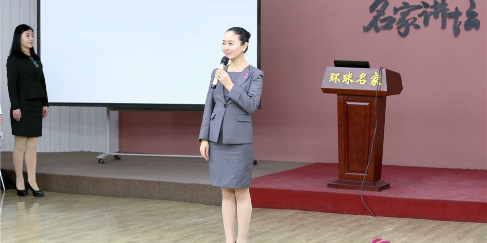 我们来到了风尚圈一号厅,采访风尚圈联合创始人、中国形象设计协会副会长徐文波。讲台上的她,一身黑色职业装,长发盘起,精致的妆容,简单大方,从容地讲解着女士站姿的礼仪要求。